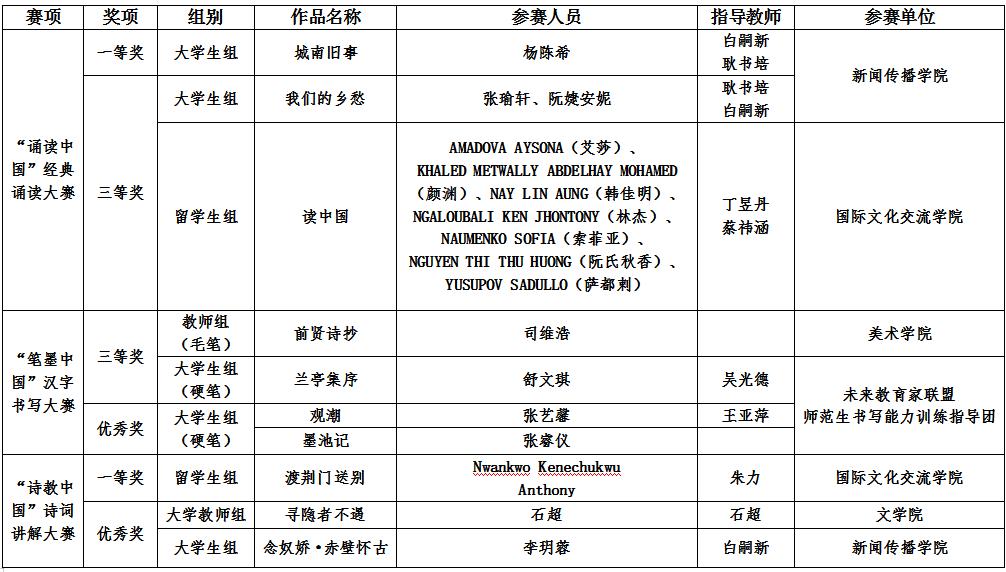 Notably, our school is the only institution in Hubei Province to win a first prize in the "Poetry Education China" Poetry Explanation Competition for International Students and one of only two universities to receive a first prize in the "Reciting China" Classic Recitation Competition. Earlier, our university has won a total of 27 awards in the Hubei regional competition of this event.