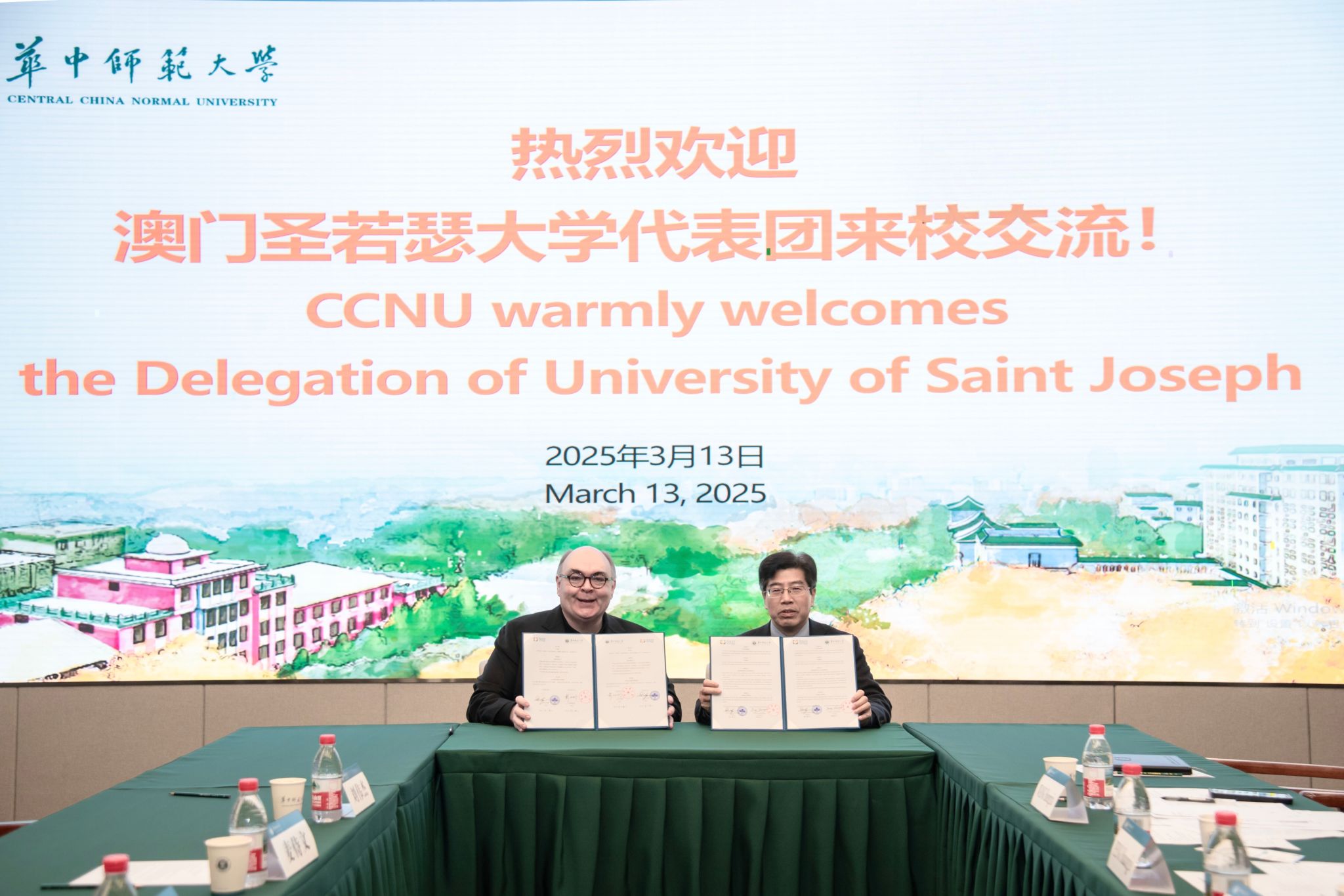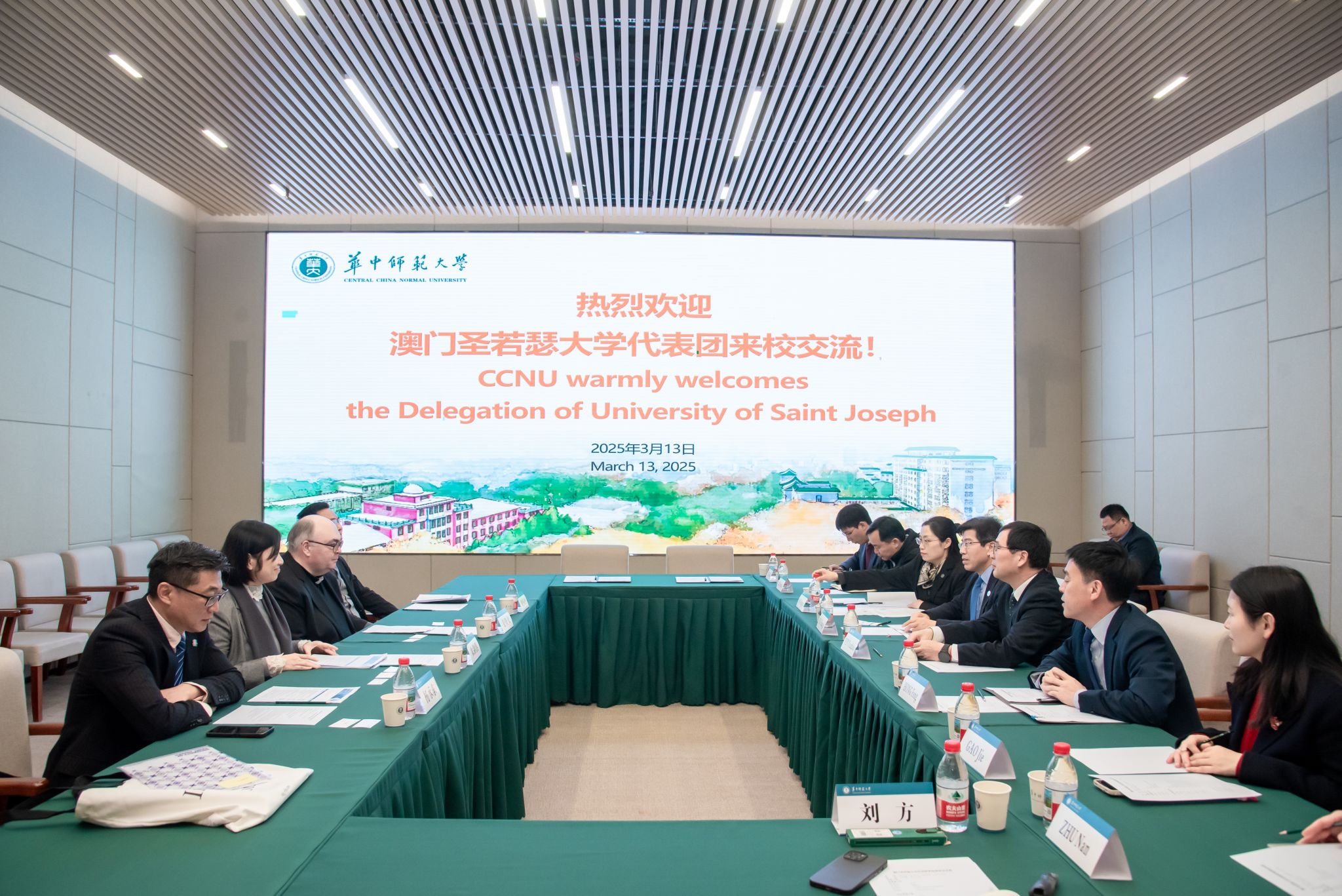 On March 13, President Stephen Morgan of The University of Saint Joseph of Macau and his delegation visited CCNU. They signed a cooperation and exchange agreement and discuss cooperation between the two universities. President Peng Shuangjie and Vice President Ren Youzhou attended the meeting. Directors and representatives from CCNU's Office of Hong Kong, Macao and Taiwan Affairs and the School of Education also participated in the discussion.