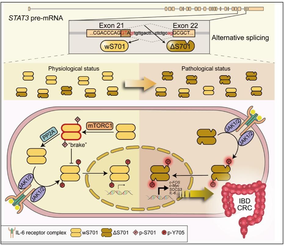 This study is the first to reveal the decisive impact of a single amino acid difference caused by alternative splicing on STAT3 function. Through an elaborate "feed-forward brake" mechanism, it has profoundly revised the understanding of colonic inflammation-tumor transformation. In the future, the development of subtype-specific diagnostic tools and targeted drugs for different STAT3 isoforms is expected to bring new therapeutic hope to patients with IBD and CRC.