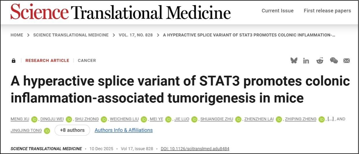 On December 10th, a research team led by professor Tong Jingjing from the School of Life Sciences of CCNU, in collaboration with the team led by Wang Zhihua from Fuwai Hospital, Chinese Academy of Medical Sciences, published their research findings online in the international journal Science Translational Medicine (also known as Sci Transl Med). The study is titled A hyperactive splice variant of STAT3 promotes colonic inflammation-associated tumorigenesis in mice.