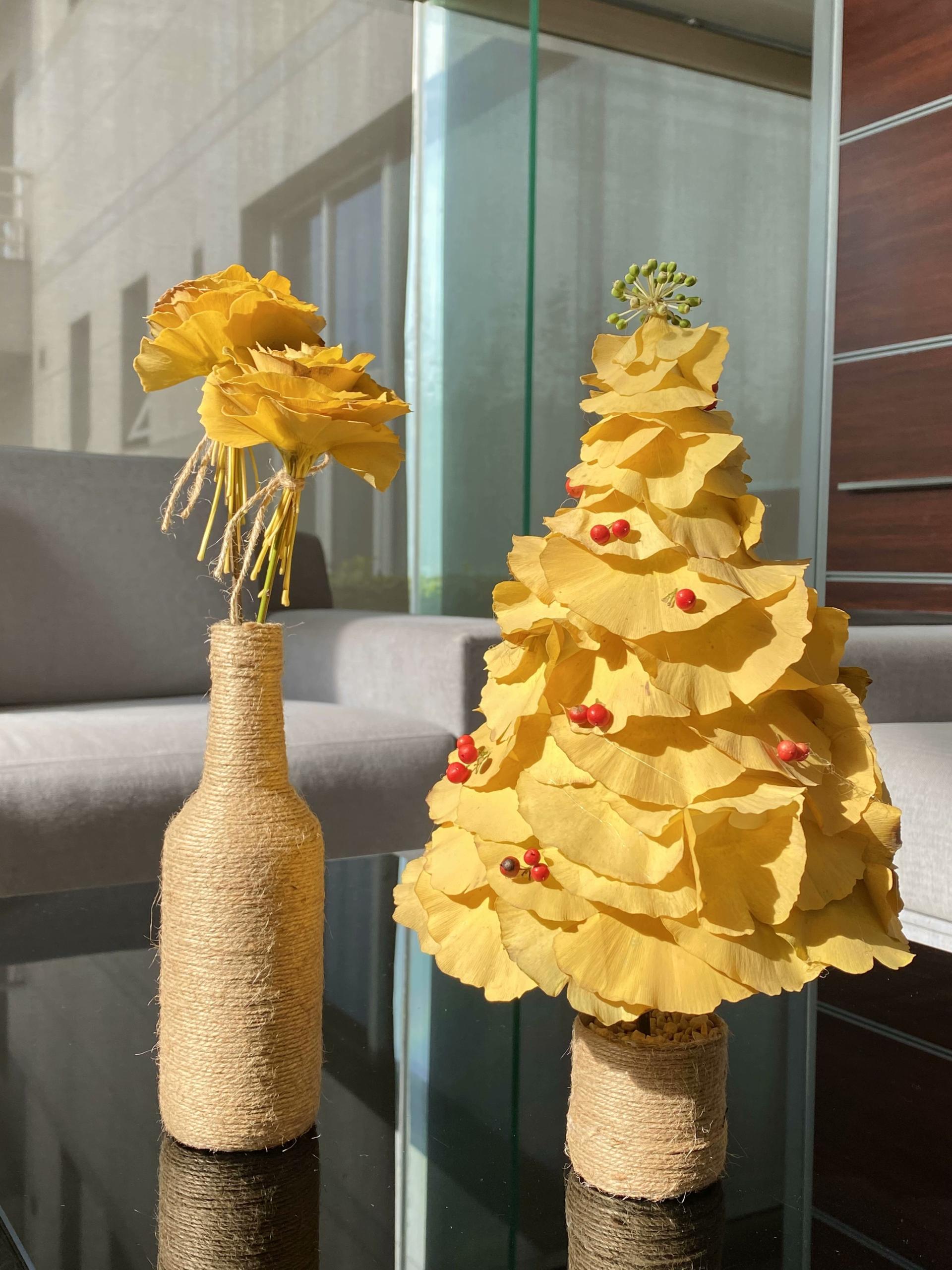 Look! A bunch of flowers is glittering under the sun. A golden butterfly is dancing in the air. A yellow Christmas tree is swinging with the wind. You can create whatever you fancy with ginkgo leaves, limited only by your imagination.