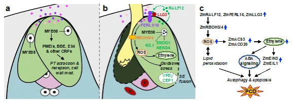 Recently, Nature Communications published research led by Professor Chen Junyi from the School of Life Sciences at Central China Normal University (CCNU), underlying programmed cell death (PCD) in persistent synergid cells after fertilization in flowering plants. The study titled "Fertilization-induced synergid cell death by RALF12-triggered ROS production and ethylene signaling" (https://www.nature.com/articles/s41467-025-58246 -y), reveals novel regulatory pathways of plant developmental PCD (dPCD). Prof. Chen Junyi and Wang Huan, a doctoral candidate of CCNU, are co-first authors, with Prof. Chen Junyi and Prof. Thomas Dresselhaus from University of Regensburg, Germany serving as corresponding authors.