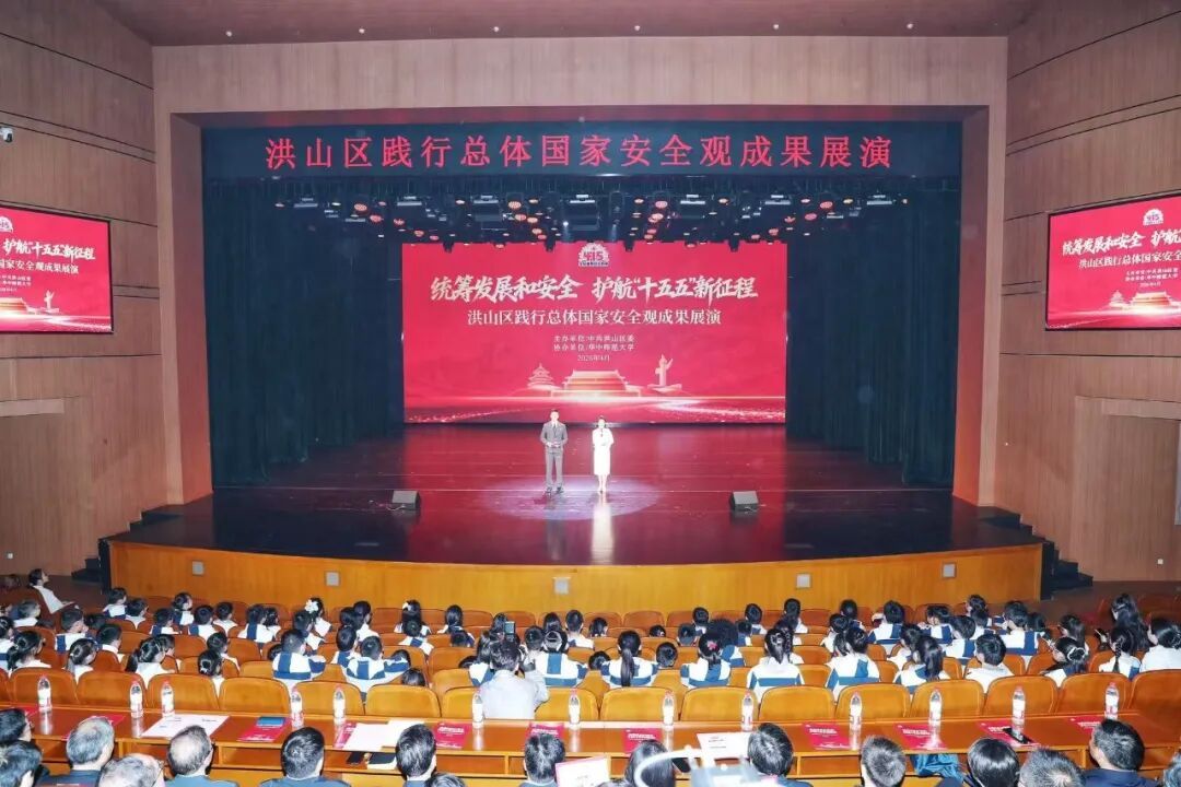 On the occasion of the 11th National Security Education Day, the Achievement Exhibition on Practicing a Holistic Approach to National Security in Hongshan District, co-hosted by Hongshan District and Central China Normal University (CCNU), was held on April 11 at the Auditorium of the University Student Activity Center. As part of the series of events for CCNU’s 4th Campus Safety Culture Festival, the exhibition was themed Balancing Development and Security to Support the New Journey of the 15th Five-Year Plan Period. Leaders from the provincial, municipal and university level, as well as about 1,000 representatives from all walks of life attended the event.