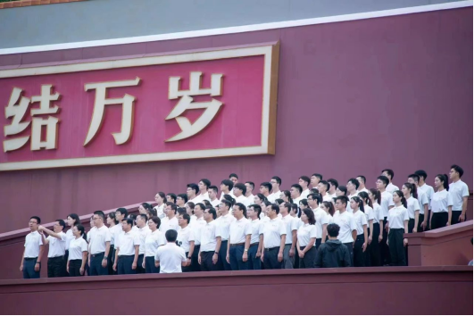 At 4:20 in the morning, the night was still dark. Facing the cool morning breeze, the teacher and student representatives gathered in formation and drove to Tiananmen Square. At about five o'clock,the whole team stood on the viewing platform, looking forward to the solemn moment of the national flag being raised. At dawn, the national flag guard walked out of the Tiananmen Gate Tower in uniform steps and marched forward with high spirits.Everyone watched silently.