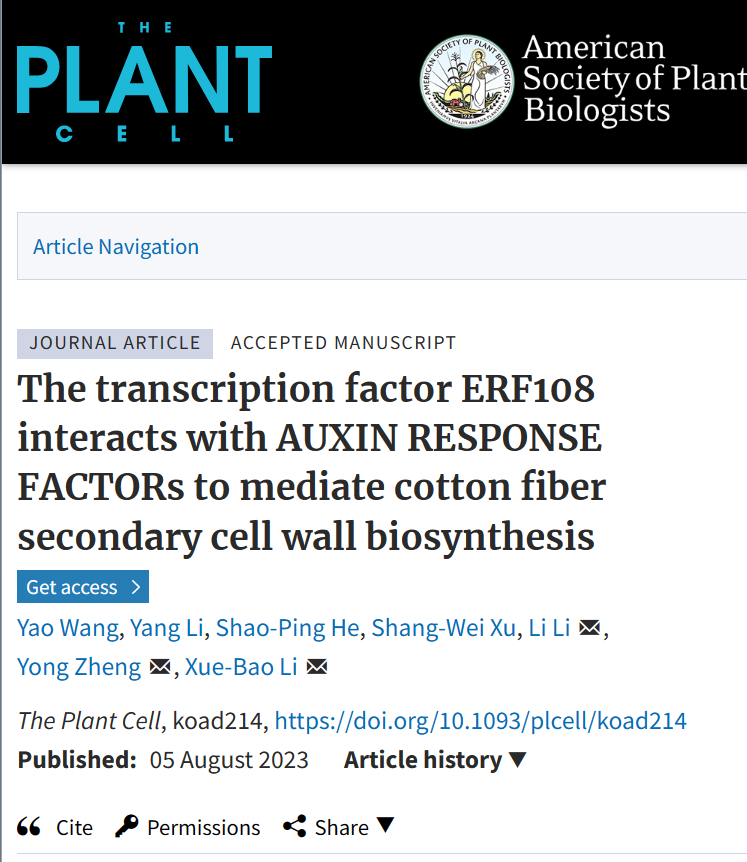 On August 5, Plant Cell, a top-tier botanical journal, has published a research paper The transcription factor ERF108 interacts with AUXIN RESPONSE FACTORs to mediate cotton fiber secondary cell wall biosynthesis by the molecular genetic research group from the School of Life Sciences in CCNU. The study reveals a new mechanism in which the AP2/ERF transcription factor GhERF108 and the auxin response factor GhARF7-1/7-2 can mediate the development of cotton fiber SCW (secondary cell wall) through the ethylene-auxin signaling crosstalk pathway.